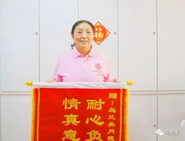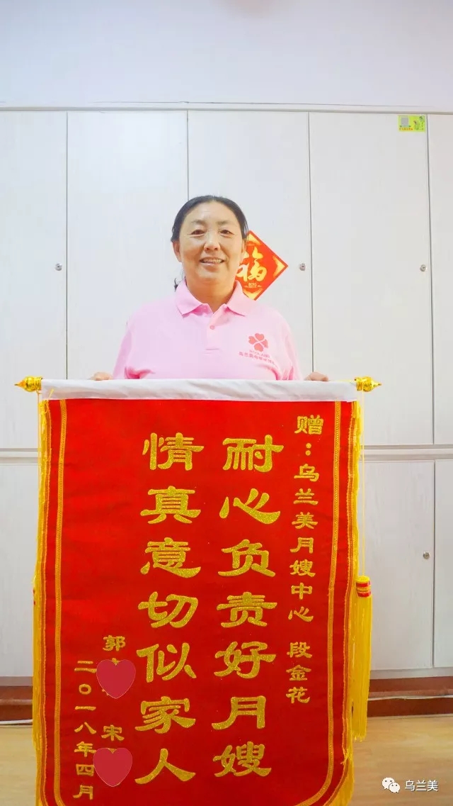 “我們清楚烏蘭美母嬰服務中心已經(jīng)收到過很多面錦旗,但是這面不同!這是一面有含金量的錦旗,它不僅僅表達了我們對烏蘭美母嬰服務中心的謝意,更是表達對烏蘭美月嫂段金花的愛意!”