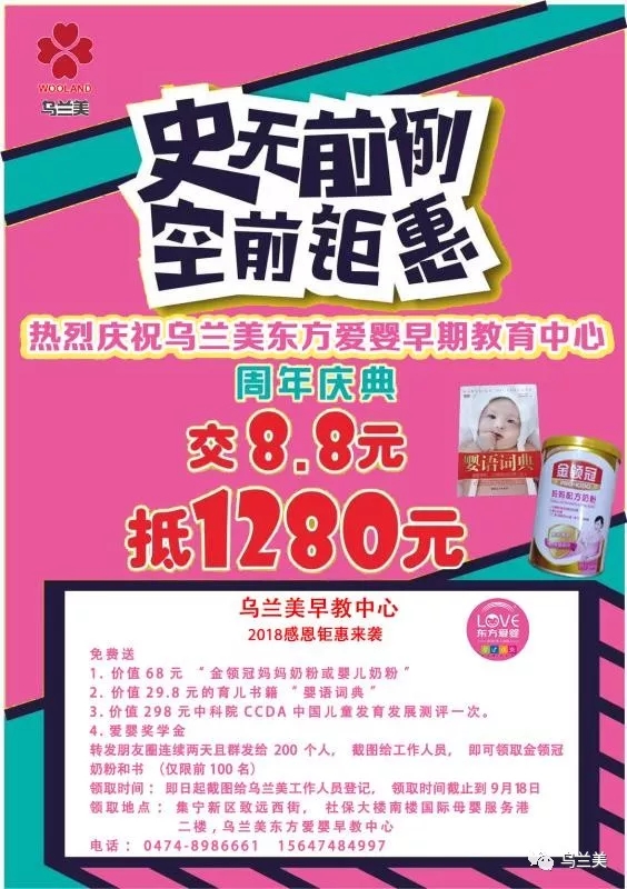 領(lǐng)取時間:即日起截圖給烏蘭美•東方愛嬰早教中心工作人員登記,領(lǐng)取時間截止到2018年9月19日。