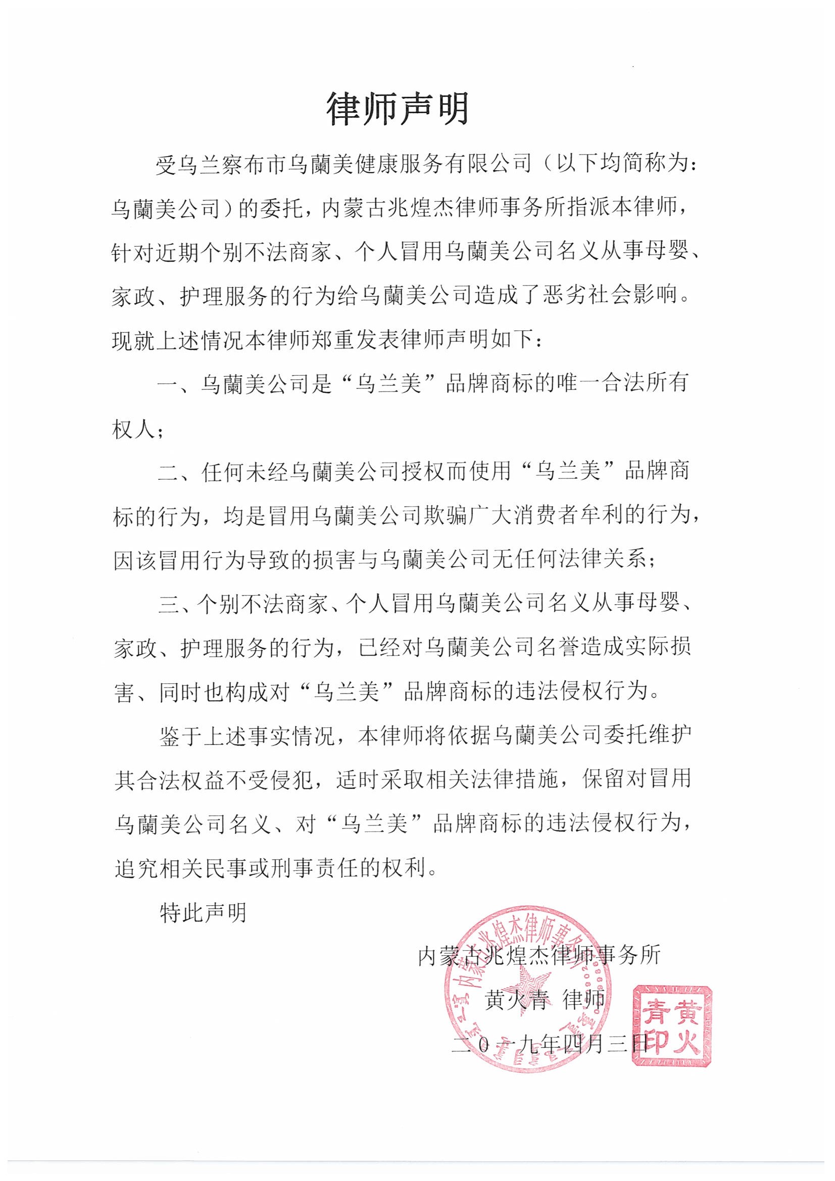 針對近期個別不法商家、個人冒用烏蘭察布市烏蘭美健康服務有限公司名義從事母嬰、家政、護理服務的行為,給公司造成了惡劣的社會影響?,F(xiàn)公司委托內(nèi)蒙古兆煌杰律師事務所黃火青律師,發(fā)表律師聲明如下: