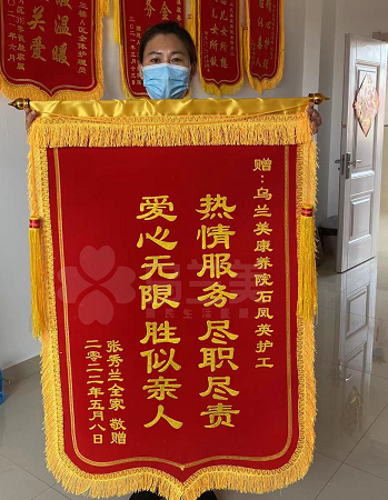 近日,烏蘭美康養(yǎng)院收到了一封致謝院內(nèi)全體工作人員的感謝信和一面送給石鳳英護(hù)理員的錦旗,錦旗上面寫(xiě)著“熱心服務(wù),盡職盡責(zé),愛(ài)心無(wú)限,勝似親人”。一句感謝的話(huà)語(yǔ),一面肯定的錦旗都承載了老人家屬對(duì)我們服務(wù)的認(rèn)可,讓我們更有一種責(zé)任感和使命感要把這份工作做好。