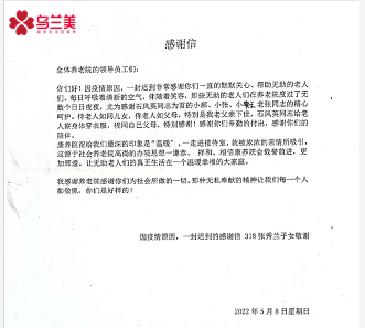 隨著錦旗一起送進(jìn)來(lái)的還有一封致謝烏蘭美康養(yǎng)院全體工作人員的感謝信,來(lái)信人是在康養(yǎng)院入住的張秀蘭奶奶的子女,他們?cè)谛胖懈兄x工作人員對(duì)張奶奶的悉心呵護(hù)、專(zhuān)業(yè)照顧、辛勤付出和陪伴,更稱(chēng)贊康養(yǎng)院為所有的老人提供了一個(gè)幸福溫暖的大家庭,最后祝愿康養(yǎng)院的明天更加輝煌。